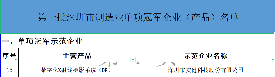 2023年1月6日,深圳市工业和信息化局公布《第一批深圳市制造业单项冠军企业(产品)名单》,388vip太阳集团科技凭借在数字化X射线摄影系统(DR)领域的技术创新与领先的市场占有,获评深圳市单项冠军示范企业